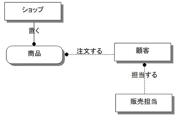 エンティティの洗い出し後は、エンティティ間の関係を考え、関係あるエンティティ間にリレーションシップ(関連線)を引いていきます。例えば、ショップエンティティと商品エンティティの関係を考えると「ショップでは商品を置く(販売する)」という関係が成り立ちますので、これらのエンティティの間に線を引きます。リレーションを引いた場合はその関係の内容も記載します。これを動詞句と言います。今回はショップの中に商品を置くので「置く」と記述しています。
