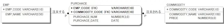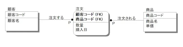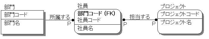 また、リレーションシップの両端にカーディナリティ(多重度)も記述しています。今回のリレーションシップは「1対多」「多対多」ですが、IDEF1X表記の場合は「多」の個所にPと記載します。