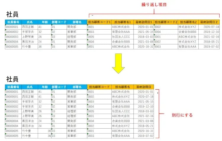 第一正規化では繰り返しが発生している属性をなくす作業を行います。例えば、図14の社員エンティティでは「担当顧客」「担当顧客名」「最終訪問日」という列が繰り返し登場しています。このような列は1種類にし、別行(別レコード)として管理するようにします。