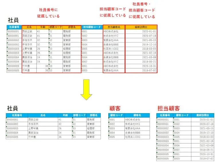第二正規化は、ある主キーとみなせる属性に従属する属性を探し、別エンティティに分割する作業です。「従属」とはある属性の値により、一意に値が定まる属性のことです。以下の例では、「氏名」~「部署名」の列は「社員番号」に従属しており、「担当顧客名」は「担当顧客コード」に従属しています。そこで、前者は社員エンティティに残しておき、後者は顧客エンティティとして新たに作成し、こちらに移動します。また、複数の属性に従属する属性もあります。「最終訪問日」は「社員番号」と「顧客コード」の2つの属性によって定まる属性です。このような場合は社員番号と顧客コードを主キーとしたエンティティを新たに作成し、「最終訪問日」をそのエンティティに移動します。