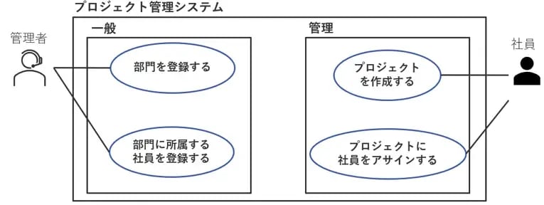 このシステムの利用者は「管理者」と「社員」に分かれています。管理者は部門およびメンバーが登録できます。その後、社員はプロジェクトを作成し、そのプロジェクトに他の部門も含めた社員をアサインできるようにします。また、部門や社員、プロジェクトでは「名前」だけ登録できれば良いものとします。ただし、同名の名前を複数登録ができるものとします。