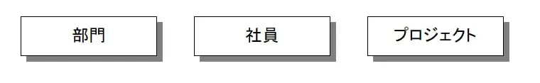 それでは、このシステムの概念モデルから設計しましょう。初めは「このシステムを実現するために、どれだけデータを入れる”箱”を用意すればよいのか」を考えればよいです。図17のユースケース図では「部門」「社員」「プロジェクト」の3つがキーワードとして登場していますので、これをリソースエンティティとして登録しましょう。(その他、イベントエンティティが必要になるケースもありますが、後で必要とわかった段階で追加すればよいです。)リソースエンティティを追加したER図は以下の通りです。