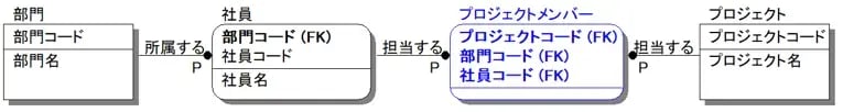 青色が仲介エンティティとなります。(名前は「プロジェクトメンバー」としましたが別の名前でも構いません。)仲介エンティティでは、お互いのアイデンティファイアを外部キーとして持たせます。これで「1対多」の関係にすることができます。