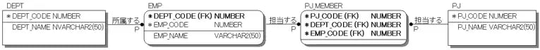 エンティティ名やアトリビュート名は論理モデルまではわかりやすい日本語にしていましたが、Oracle Database等の物理データベース上はアルファベットにするのが慣例です。そこで「顧客」を「EMP」、「顧客コード」を「EMP_CODE」など、アルファベットに変更します。