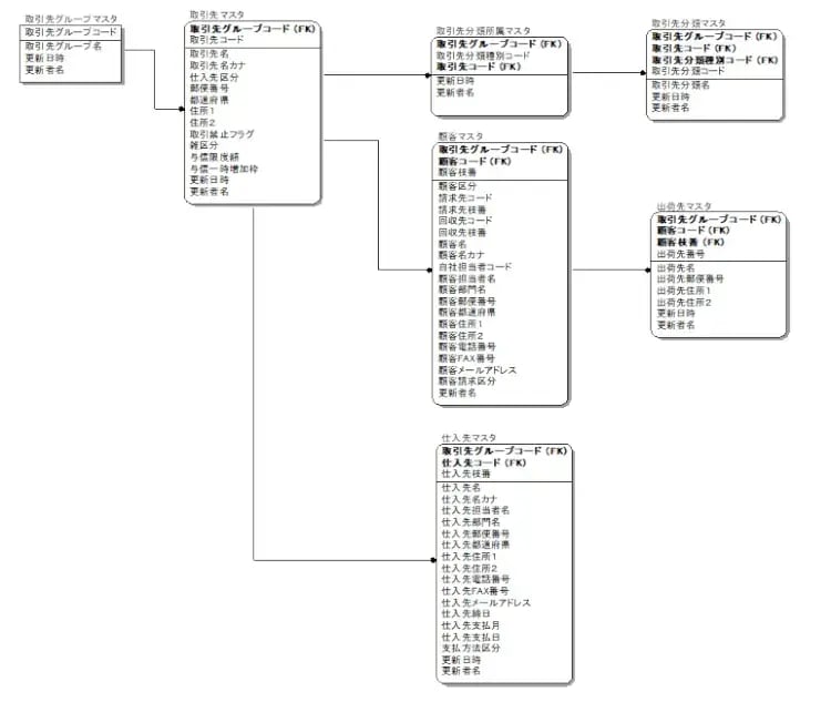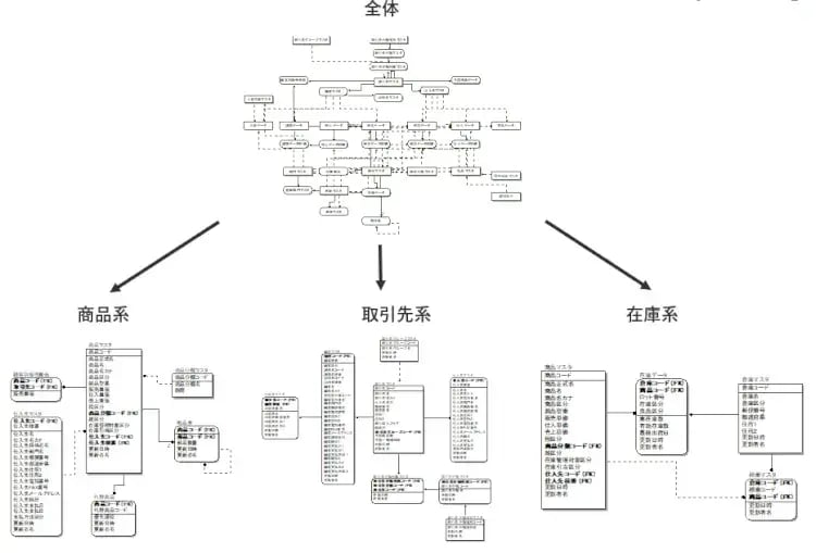 大規模なシステムの場合はすべてのエンティティが一画面に入りきらなくなり、把握がしづらくなります。そのような場合はER図の分割を行います。分割する際は「商品系」「取引系」といった業務分類で分割する、ERPのシステムであれば「売掛」「買掛」などのサブシステム単位で分割するなどのルールを決めてグループ分けすると後で探しやすくなります。また、ExcelやVisioであれば1ファイルの中で別シートにして分割することができます。