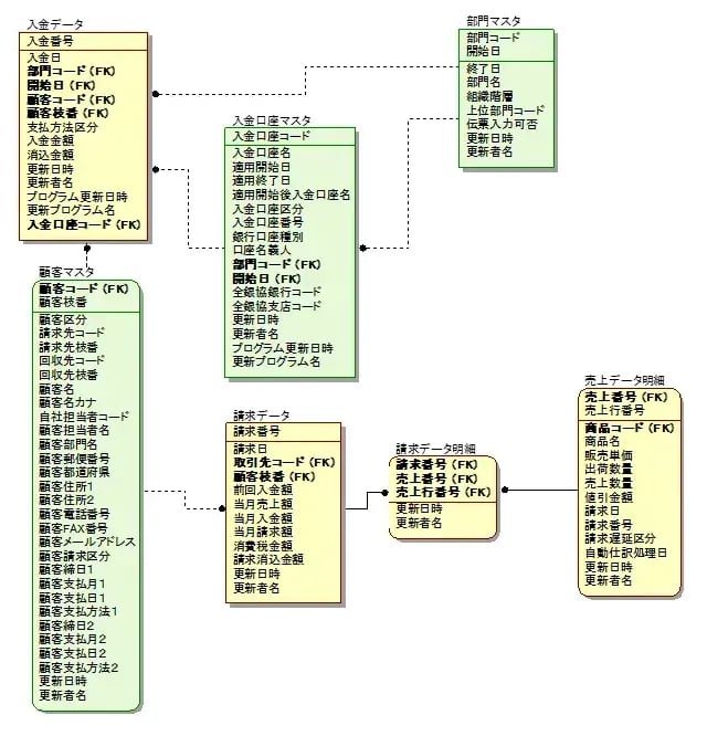 エンティティには最終的にマスタ系のテーブルとなる「リソースエンティティ」とトランザクションを管理するテーブルとなる「イベントエンティティ」の2種類に分かれますが、これらを色分けしておくとデータと業務の関連がわかりやすくなります。リソースエンティティを緑、イベントエンティティを黄色で色分けした例は以下の通りです。「顧客には請求と入金という業務がある」「入金口座マスタは入金業務でのみ使う」などの内容がすぐに把握できるようになります。