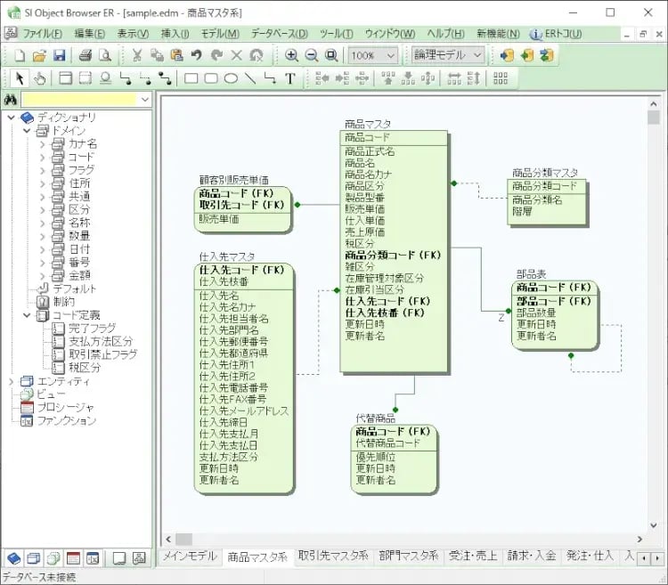 簡単なマウス操作でエンティティやリレーションシップの配置が作図できます。概念モデル用のエンティティや、論理モデル、物理モデル用のアトリビュートをそれぞれ定義し、データモデルの表示切り替えが可能です。また、ER図を見やすくシート分割し、かつ分割後の整合性も保てる「サブモデル」機能や、複数のエンティティで共通的に使うアトリビュートに対してテンプレート化ができる「ドメイン」機能などを備えており、ER図作成の効率、品質の両方を高めることができます。