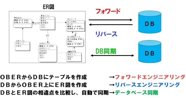 さきほどもER図から物理データベースの構築する方法をご紹介しましたが、手動でスクリプトを作成するのはやはり手間です。そこでOBERでは、ER図情報を元に自動でスクリプトを生成し、物理データベースを構築できる「フォワードエンジニアリング」機能を備えています。この機能により、ER図作成後はスムーズに物理データベース構築が可能となっています。