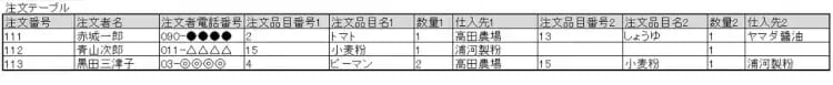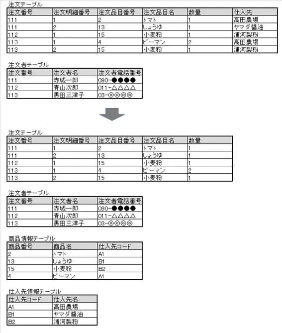 この場合、ある商品の仕入れ先を変更した場合に注文テーブルにて該当商品のすべてのレコードを更新することになり件数が膨大になります。