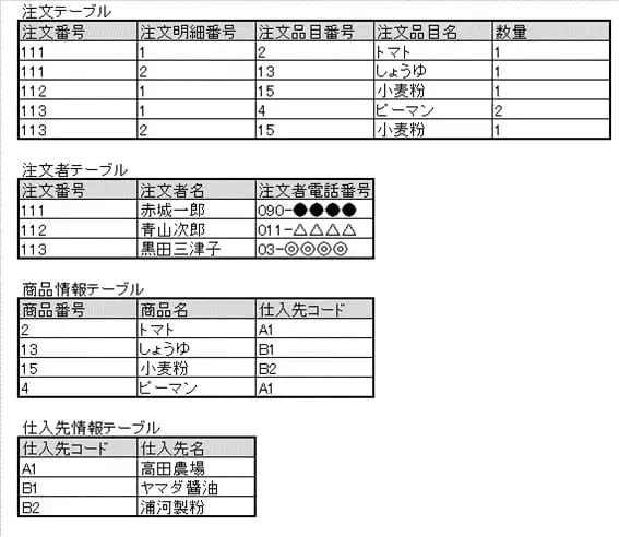 注文テーブルにおいて「注文品目番号」や「数量」は、「注文番号」「注文明細番号」によって決定されますが、注文者の情報は「注文番号」のみで特定することができます。この場合、注文テーブルの主キーは「注文番号」「注文明細番号」であり、注文者に関する情報は主キーの一部である「注文番号」に部分関数従属しています。このような形の表は、お客様の電話番号などが変わったときにそのお客様の注文の数だけデータ更新が必要になり、非効率です。