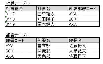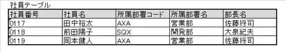 一方、このように正規化された表の場合、部署名や部長名の変更は部署テーブルの一行だけを更新すればよいので、データに矛盾が発生しにくいです。
