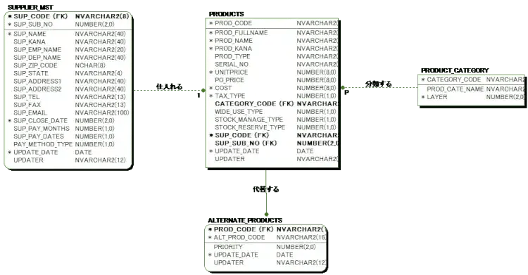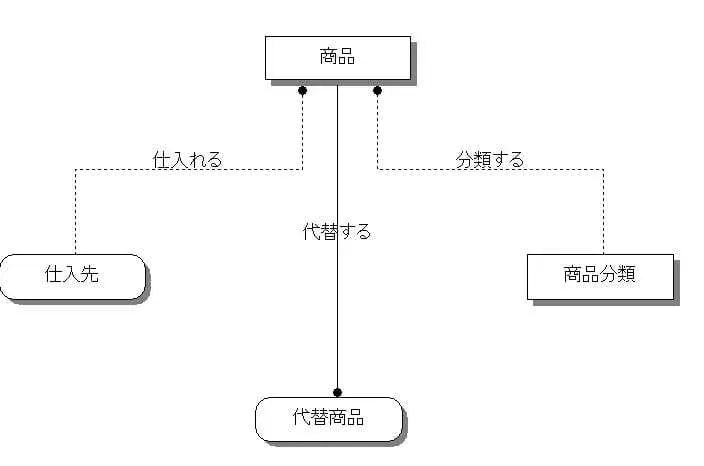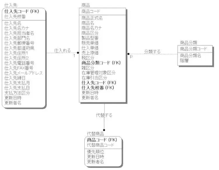 論理データモデルは、概念データモデルをもとに構築され、例として以下の図のように表現されます。