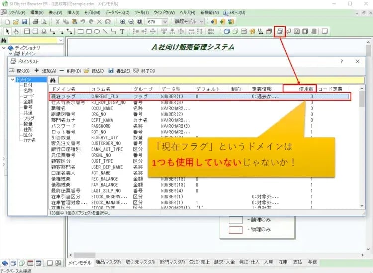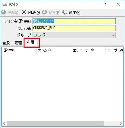 念のため「現在フラグ」をダブルクリックして、ドメインを開いて利用タブを見てみましょう。