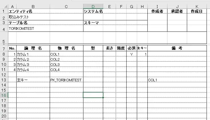 では早速取り込んでみましょう。下記のようなテーブル定義書を用意しました。こちらはOBERからデフォルトフォーマットどおりに出力したエンティティ定義書(=テーブル定義書)です。後述しますが、デフォルト配置のエンティティ定義書は特別な設定は必要なくOBERに取り込むことが可能です。
