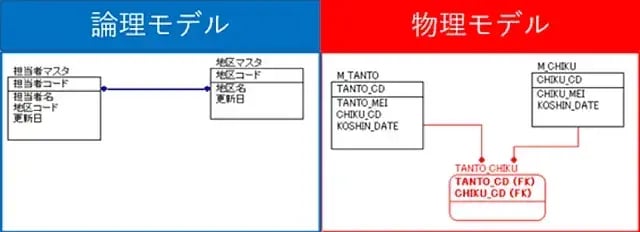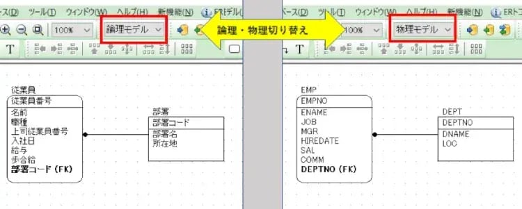 まずよくやるのが、物理モデル上でアルファベットを使用して英語やローマ字で設計したテーブル名やカラム名を、論理モデル上では日本語で定義することです。