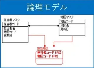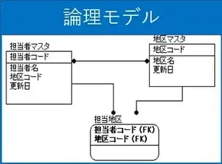 まずは下記のように論理、物理上での設計を行います。論理モデル上にも担当地区エンティティが見えている状態です。