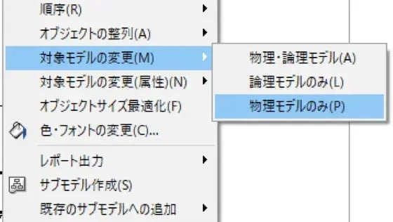 OBERでは論理オブジェクト、物理オブジェクトの設定が可能です。対象オブジェクトの右クリックメニューから実施します。ここでは担当地区エンティティと、それに伸びている依存リレーションを物理のみの情報へと切り替えます。