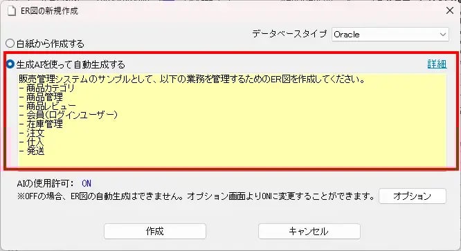 ER図を生成AIを使って自動生成できる機能を搭載しました。最新バージョンでは、ER図の新規作成時に、画面1のダイアログが表示されます。このとき、「生成AIを使って自動生成する」を選択し、テキスト欄に作成したいER図の要件を入力しましょう。