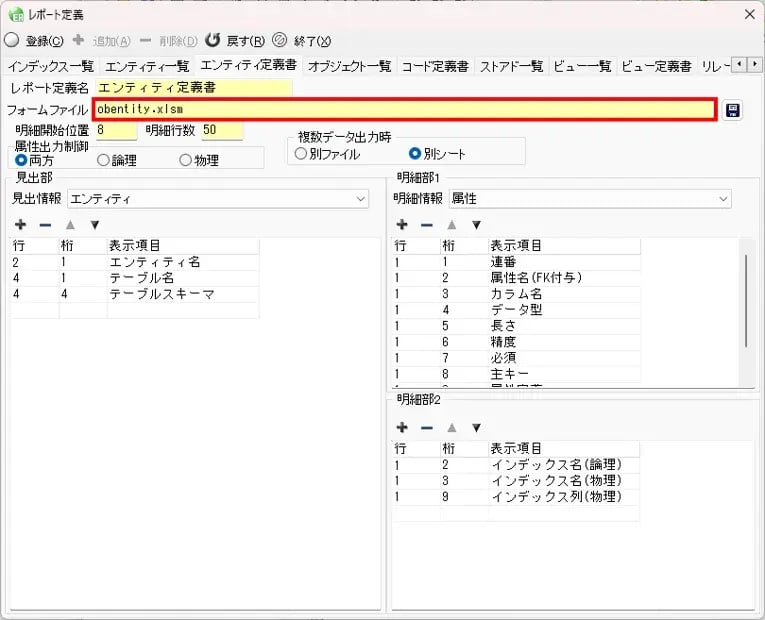 エンティティ定義書などのレポート生成機能にて、Excelマクロ形式のレポートが生成可能となりました。「ツール」メニュー→「レポート定義」を選択すると表示されるレポート定義画面より、マクロ形式のExcelファイル(xlsmファイル)が登録できるようになっています。事前にオリジナルのマクロつきのフォーマットファイルを登録することでマクロつきのエンティティ定義書が生成できます。