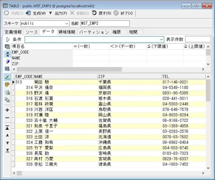 今回は下記の社員テーブルの移行を例に説明します。前回同様、下記テーブル及びデータをOracleからPostgreSQLへ移行していきます。