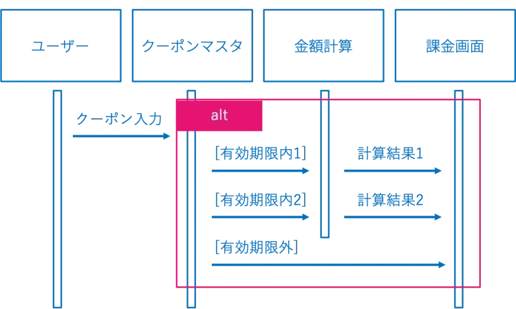 条件分岐を複合フラグメントで示す場合は、「alt」の記号を使用します。条件分岐の条件については、” [ ]”(ガードと呼ばれる括弧)で囲んで記述します。