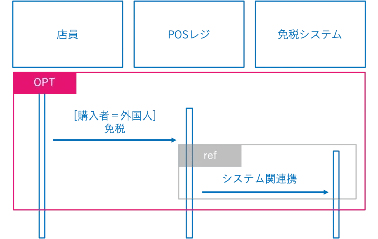 「alt」と類似している複合フラグメントとなりますが、「alt」はA・Bどちらかに分岐させるのに対して、「opt」はAとA以外はすべてBというような処理が行われることが特徴です。