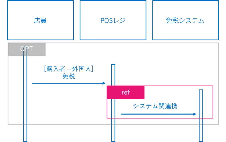 「ref」は、「囲まれている部分は、外部のシーケンス図を参照して下さい」という意味の複合フラグメントです。システムの規模が大きくなったり複雑化したりして、1つのシーケンス図には収まりきらない場合に使用されます。