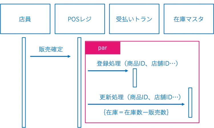 並列処理が用いられるケースとしては、例えば通販サイトでの販売確定時に注文処理システムと在庫管理システムの更新処理を同時に行う場合などが挙げられます。