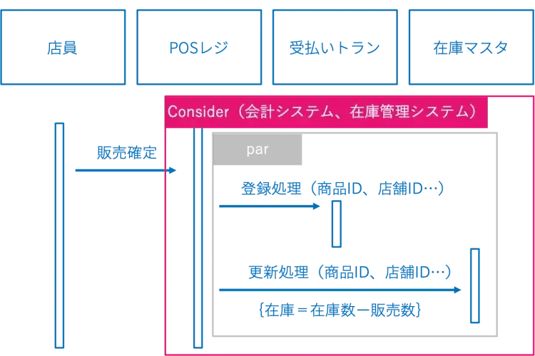 例えば通販サイト・実店舗の受注管理システムの場合だと、「Consider{会計システム、在庫管理システム}」のように処理内容の記述を行います。