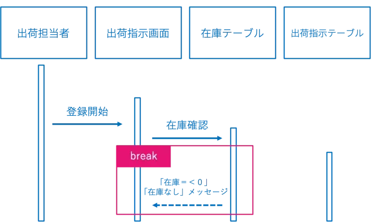 「break」の複合フラグメントは、指定した条件を満たした場合に処理を中断する際に使用される複合フラグメントです。中断の条件は「break[在庫=<0]在庫切れメッセージ」のように[]内に記述します。
