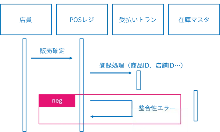 否定処理が使用されるケースとしては、在庫管理システムで在庫マスタの更新を行う際に、通常の処理手順では整合性が取れない場合などに整合性エラーを返す処理等が挙げられます。