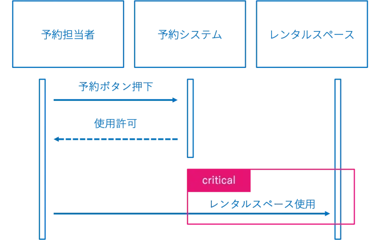 例えば、レンタルスペースの使用中処理と予約受付処理を並行処理する予約管理システムの場合だと、レンタルスペースの使用中は「critical」で使用中処理の保護を行います。