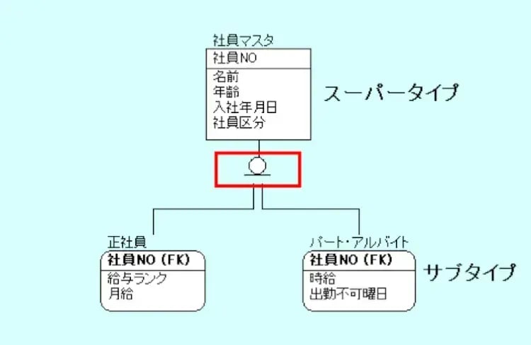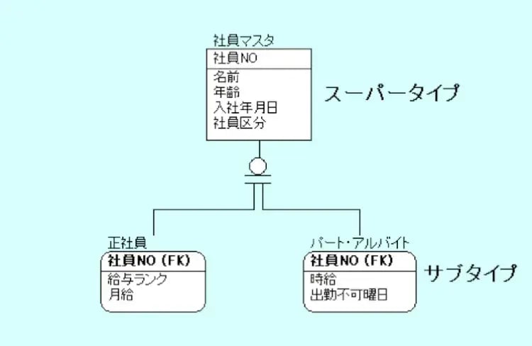サブタイプの説明でよく出てくる社員を表現したER図です。親である社員マスタにぶら下がるように、正社員とパート・アルバイトエンティティが定義されています。スーパータイプと呼ばれる社員マスタには基本となる項目が定義されており、サブタイプとなる正社員とパート・アルバイトにはそれぞれ固有の項目が設定されているのがわかります。これが「親エンティティの内容によって関連するエンティティが分類分けできるケース」となるわけです。