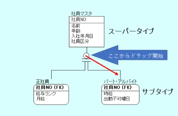 になります。親エンティティから直接引くことは可能ですが、この場合正社員とパート・アルバイトは別種のサブタイプという扱いになります。今回の場合は同種のサブタイプですので、ドラッグ開始位置には注意しましょう。