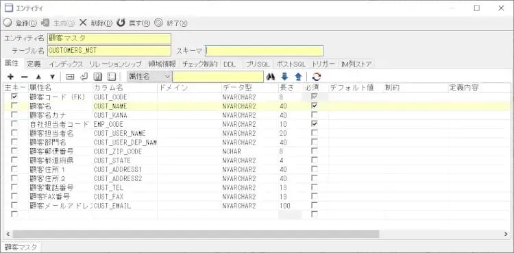これで、ドメインが作成されました。作成後は、エンティティをダブルクリックした後の詳細画面のドメイン列にて、作成したドメインを指定するだけで属性の追加できます。ドメインで登録した属性名やカラム名やデータ型などの情報がすぐにセットされます。
