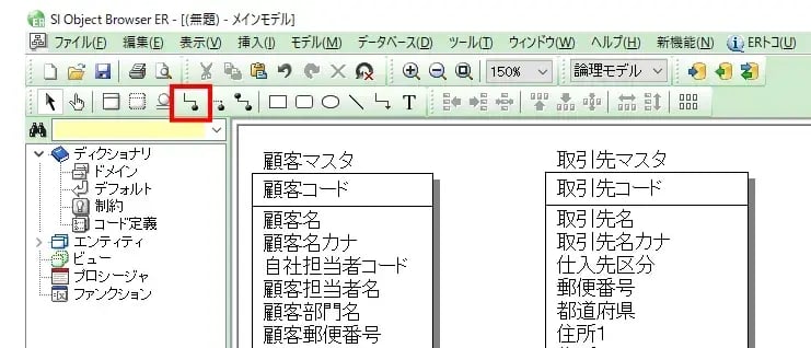 エンティティを配置後は、続けてリレーションシップを設定しましょう。ツールバーに「依存」、「非依存」、「多対多」のリレーション設定用のアイコンが用意されています。今回の例では依存関係となるテーブル間でリレーションシップを設定するので、赤枠の「依存型リレーションシップ」を選択しましょう。
