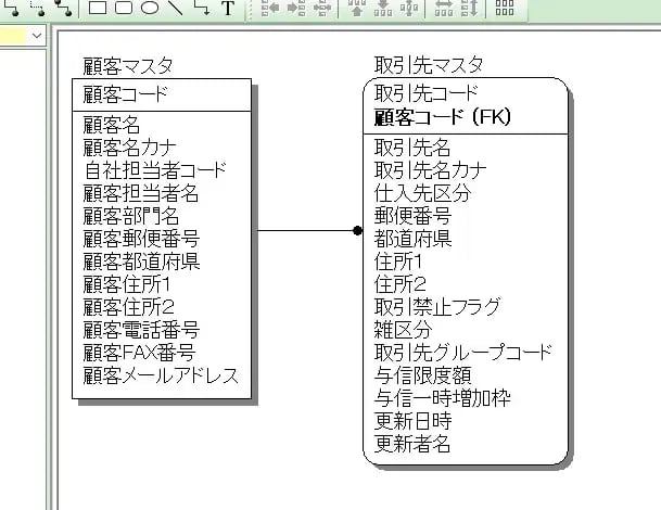 親となるエンティティでクリック後、マウスを押したまま子エンティティまでドラッグするとエンティティ間にリレーションシップが引かれます。画面9の例では「顧客マスタ」が親エンティティ、「取引先マスタ」が子エンティティとなっています。子エンティティには自動で外部キーも作成されます。
