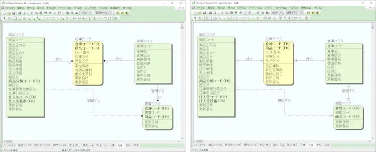 表記法を切り替える 既定ではIDEF1X表記となっていますが表示メニュー→表記法よりIE表記に切り替えることも可能です。画面9の左がIDEF1X、右がIE表記の例です。(リレーションシップの表記方法が異なります。)