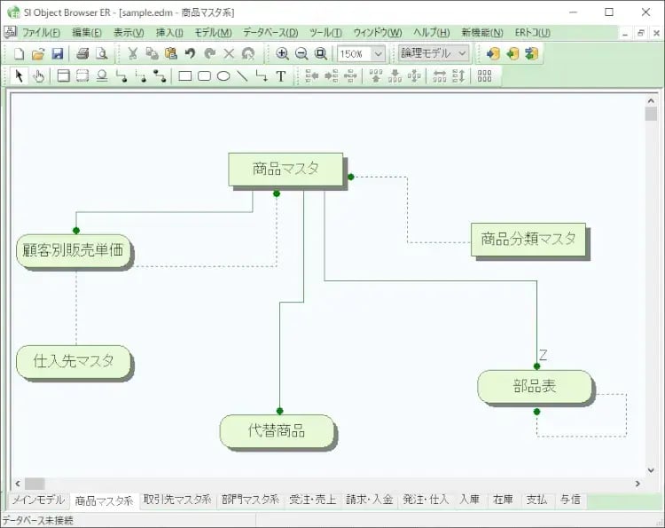 これで「商品マスタ系」という別シートが追加されました。分割後は、エンティティのレイアウトなどの情報は各シートごとに変えることができますが、エンティティの属性追加や削除といった定義情報の変更については全シートで同期がとられますので、分割後もシート間で不整合を起こすことはありません。