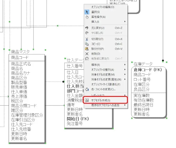 このようなかたちでどんどんとエンティティとリレーションシップを配置していきますが、エンティティが多くなり見づらくなる場合があります。その場合は、サブモデルという機能でシート分割しましょう。分割したいエンティティをマウスで範囲選択して右クリックします。