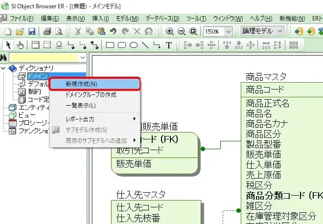 また、属性の中には「最終更新日付」など、複数のエンティティ共通で利用したい属性もあります。そのような場合は「ドメイン」という機能でテンプレート化することができます。左側のツリーにある「ドメイン」を右クリックし、「新規作成」をクリックします。