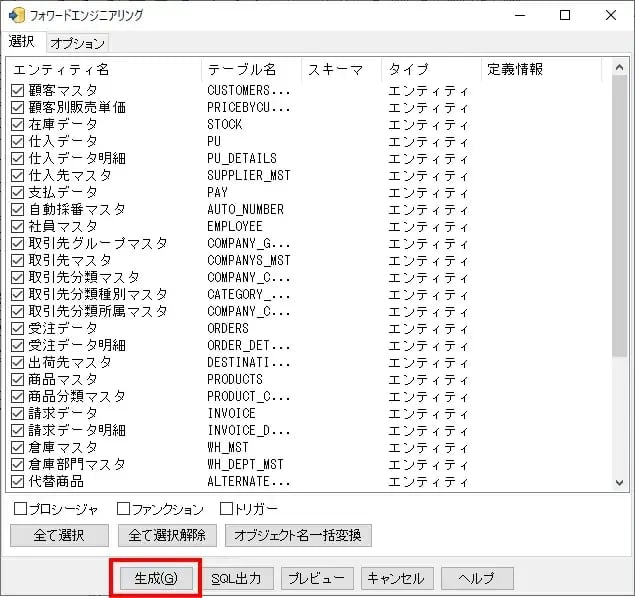 のアイコンをクリックします。以下の画面が表示されますので対象のエンティティを選択して「SQL生成」ボタンをクリックします。