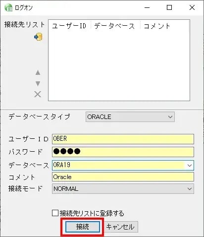 続けてデータベース接続ダイアログが表示されますので、対象のデータベースを選択しましょう。Oracle、SQL Server、HiRDB、PostgreSQL、MySQLのいずれかから選択できます。また、あわせて接続先のユーザー(スキーマ)、パスワード、データベース名などの情報を入力します。(Oracleの場合、データベース名はサービス名となります。)「接続先リストに登録する」のチェックボックスをONにしておくと、次回から接続情報が記憶されますので、簡単に接続できるようになります。入力後、「接続」ボタンをクリックします。