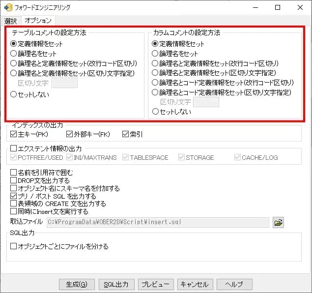この状態で実行すると、「COMMENT ON TABLE」または「COMMENT ON COLUMN」というSQL文が追加され、物理データベース情報にコメント情報が追加されます。(このSQLはOracle Databaseの場合となりますが、他のデータベースでも同様の機能が用意されているため、埋め込むことが可能です。) |
