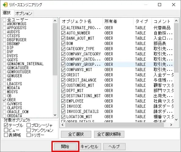 のアイコンをクリックします。画面23と同じログイン画面が表示されますので、対象のデータベースおよびユーザー(スキーマ)、パスワードなどを入力して接続します。対象のテーブル選択する画面が表示されますのでER図にしたいテーブルを選択します。(既定ではすべてのテーブルが選択されています。)設定後、「開始」ボタンをクリックしましょう。