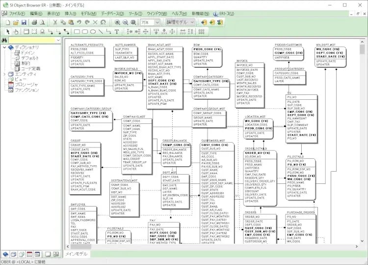 上記設定後、リバースエンジニアリングを実行することで、以下のように論理モデル(日本語モデル)が自動生成されます。ツールバーにあるプルダウンより、物理モデルの切り替えも可能です。