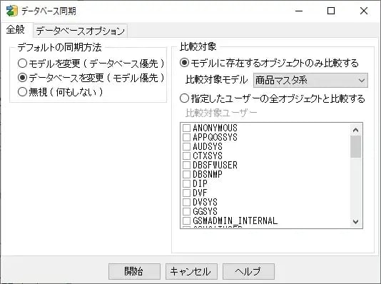 次に以下の画面が表示されますので、ER図と物理データベースのどちらを正とするのかを選択します。例えば、仕様変更によりER図を修正していた場合は、ER図が最新の内容となりますので、「(データベースを変更)モデル優先」を選択します。その後「開始」ボタンをクリックします。