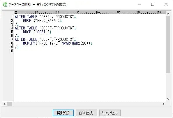 もし「データベースを変更(モデル優先)」を設定していた場合は、続けて同期を実行するためのSQLがプレビューが表示されます。問題なければ「開始」ボタンをクリックします。これでSQLが実行され、ER図とデータベースが同期されます。