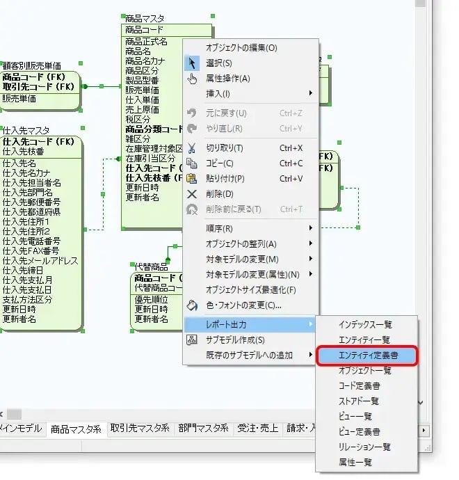 また、SI Object Browser ERではER図情報を元にエンティティ定義書(テーブル定義書)などのドキュメントが出力できます。「ファイル」メニューの「レポート出力」>「エンティティ定義書」を選択するか、ER図上で対象のエンティティを選択して右クリック、「レポート出力」>「エンティティ定義書」を選択しましょう。
