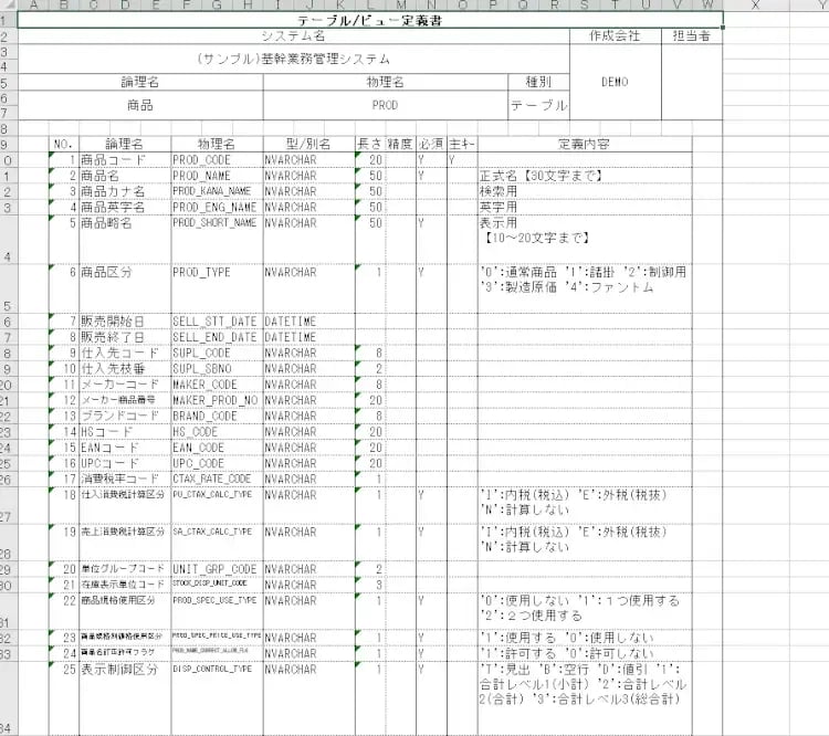 テーブル定義書とはデータベースのテーブルを定義したものです。